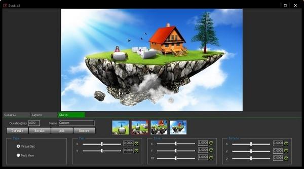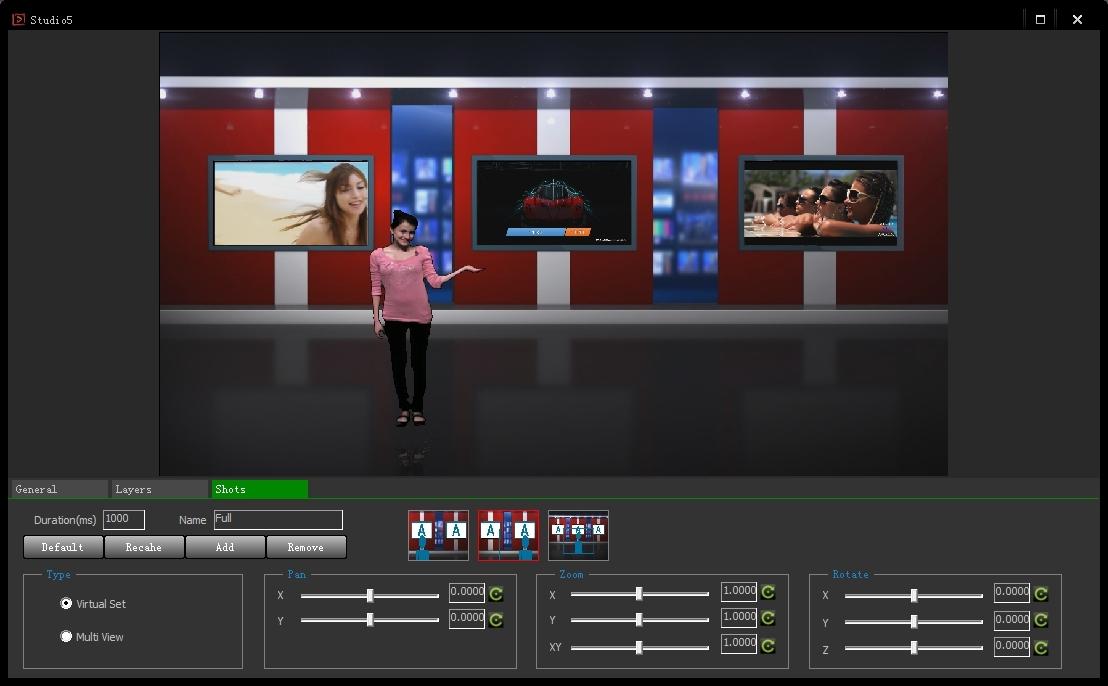 通过选用虚拟场景模版,结合高质量实时抠像功能,轻松搭建虚拟演播室。多机位、多镜头一键推拉摇移;一键抠像,色键颜色可任意设定。